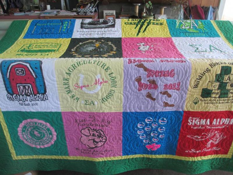 Traditionally set T-shirt Quilts with sashing are $16.00 per square. Sashing is a colored strip of fabric between each square. It typically matches the backing color.